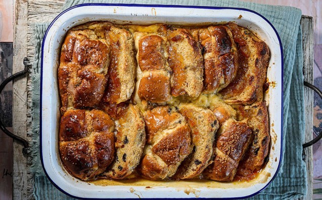 - Pour custard over your hot cross buns and leave to soak in for 10-15 mins. Sprinkle with demerara sugar and then bake for 45-50 mins until golden.